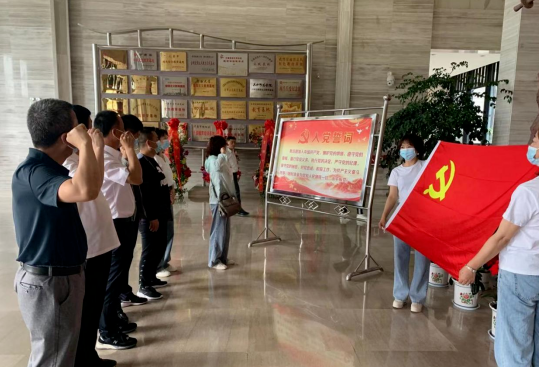 在莊嚴(yán)的紀(jì)念館序廳革命先輩浮雕前,全體黨員干部面對鮮紅的黨旗重溫了入黨誓詞。